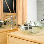 Badeværelset har en brusekabine og separat toilet, mens værelse har en balkon, en sofa og et opholdsområde.